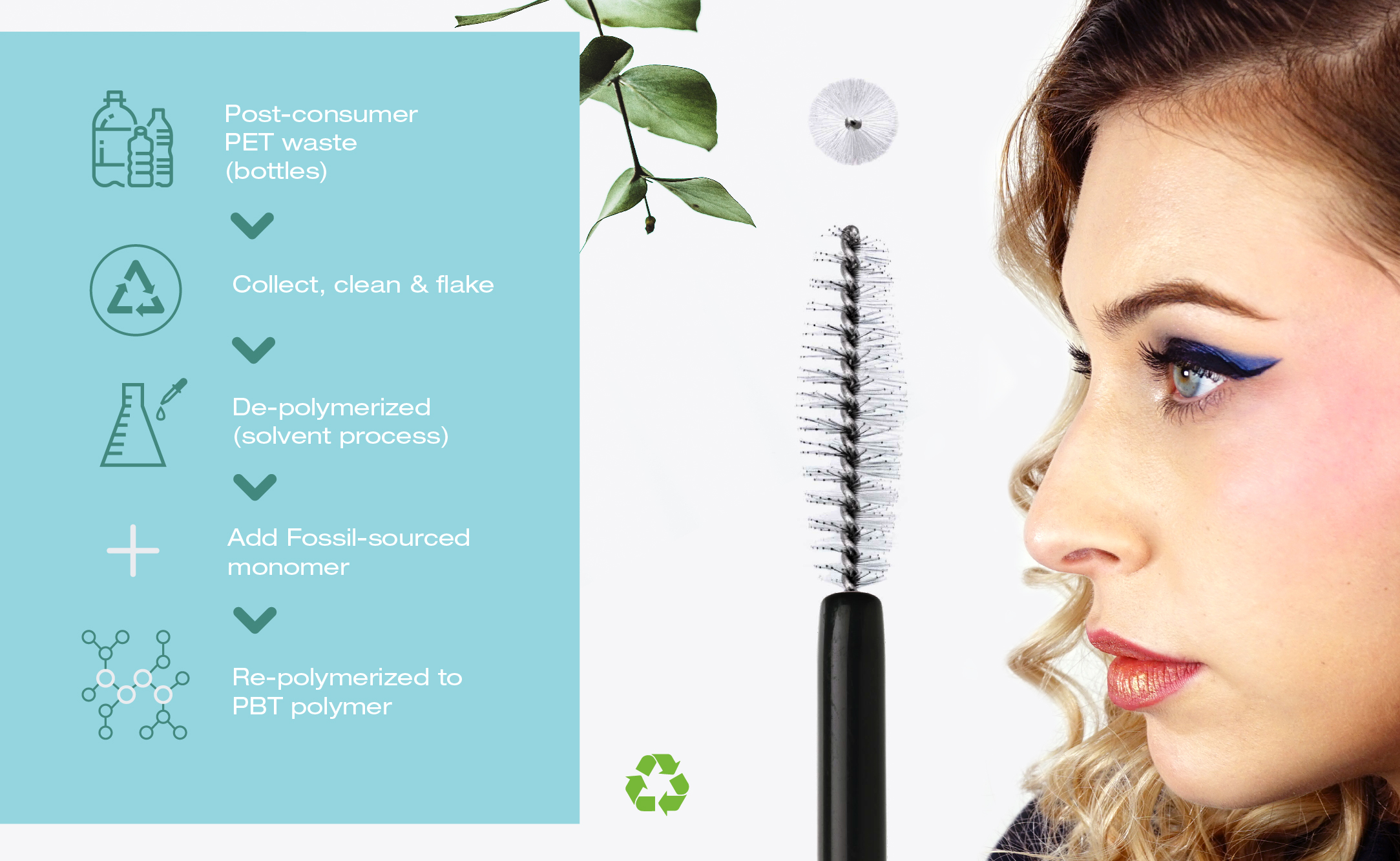 Our brand new mascara CLEAR ARROW APP520 brush is made from a post-consumer-recycled material. This new fiber material is 65 % made from post consumer PET-water bottles, FDA compliant and an excellent addition to our sustainable solutions. Post consumer PET water bottles are collected, cleaned and cut into small flakes. After this the PET is then de-polymerized and after re-polymerized to this new transparent fiber material.
